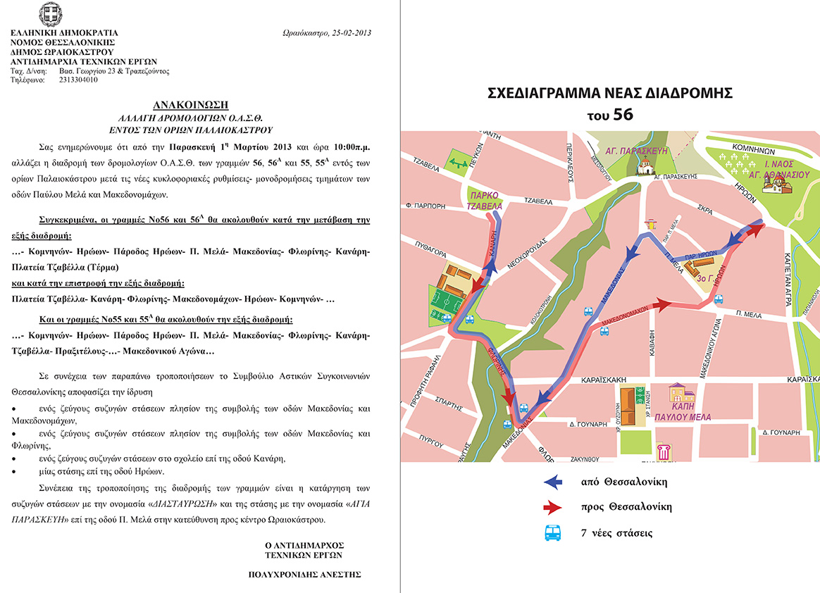 Σας ενημερώνουμε ότι από την Παρασκευή 1η Μαρτίου 2013 και ώρα 10:00π.μ. αλλάζει η διαδρομή των δρομολογίων Ο.Α.Σ.Θ. των γραμμών 56, 56Α και 55, 55Α εντός των ορίων Παλαιοκάστρου μετά τις νέες κυκλοφοριακές ρυθμίσεις-μονοδρομήσεις τμημάτων των οδών Παύλου Μελά και Μακεδονομάχων.