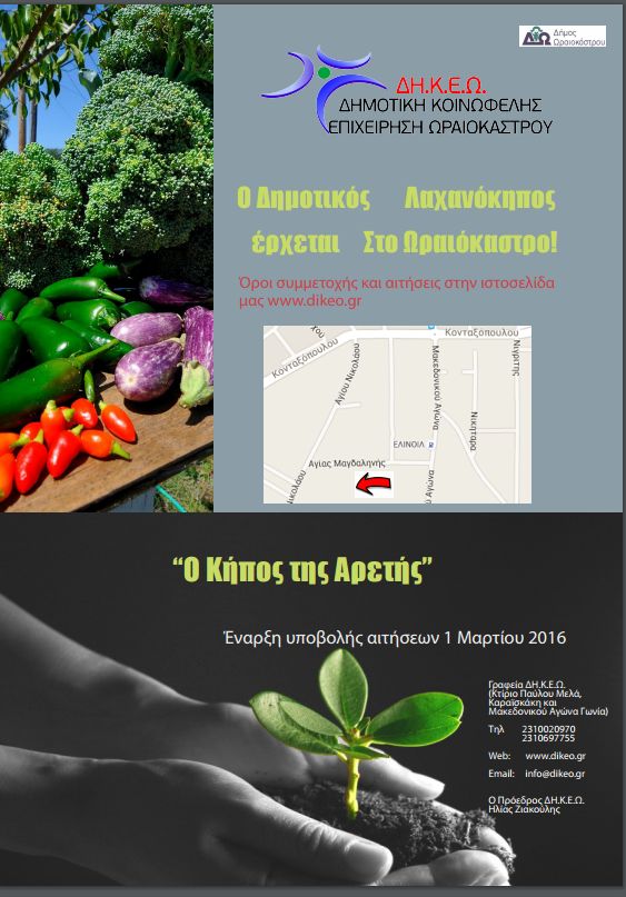 Από σήμερα 1 Μαρτίου 2016 γίνονται δεκτές οι αιτήσεις για τη συμμετοχή σας στο δημοτικό λαχανόκηπο στα γραφεία της ΔΗΚΕΩ στο κτίριο «ΠΑΥΛΟΣ ΜΕΛΑΣ».